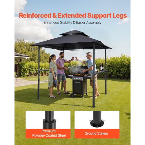Grillpaviljong, 2,43 x 1,5 m förstärkt utomhusgrillpaviljong med dubbelt tak, pulverlackerat stålgrilltak med 2 sidohyllor och 8 krokar, grilltak för uteplats, bakgård och trädgård | EU