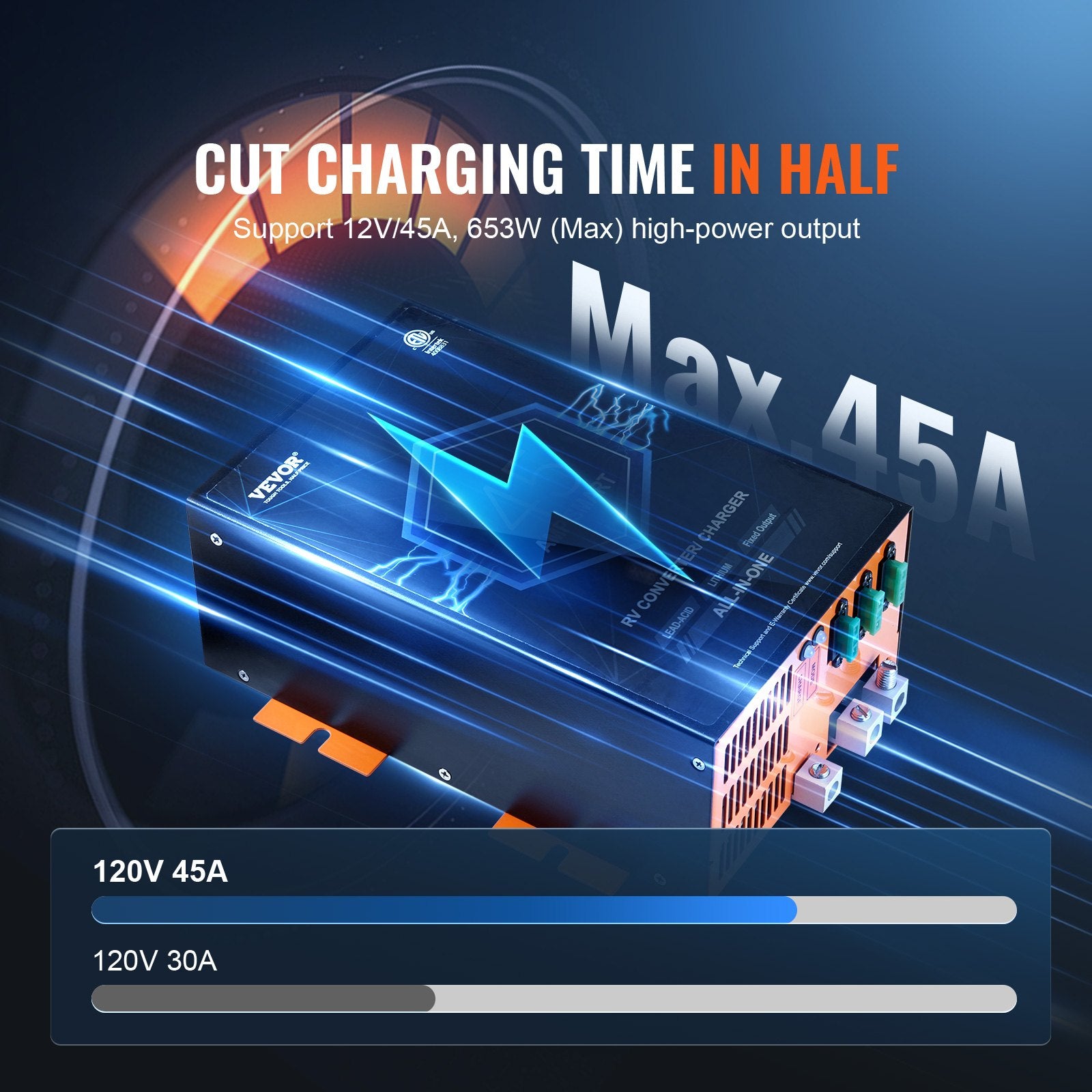 - High-Performance 45A Converter: Delivering up to 45A of clean current, our RV power converter charge effortlessly drives all your RV electronics and appliances, from sound systems to lighting, ensuring comfort on every journey. Ideal for smaller capacity RV batteries ranging from 30Ah to 50Ah.