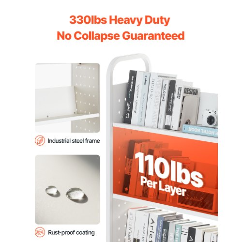 Stable load-bearing: Made of high-strength carbon steel, each layer of the rolling book cart supports 50kg, with a total capacity of 150kg. The rust-resistant coating ensures durability, perfect for heavy books or equipment