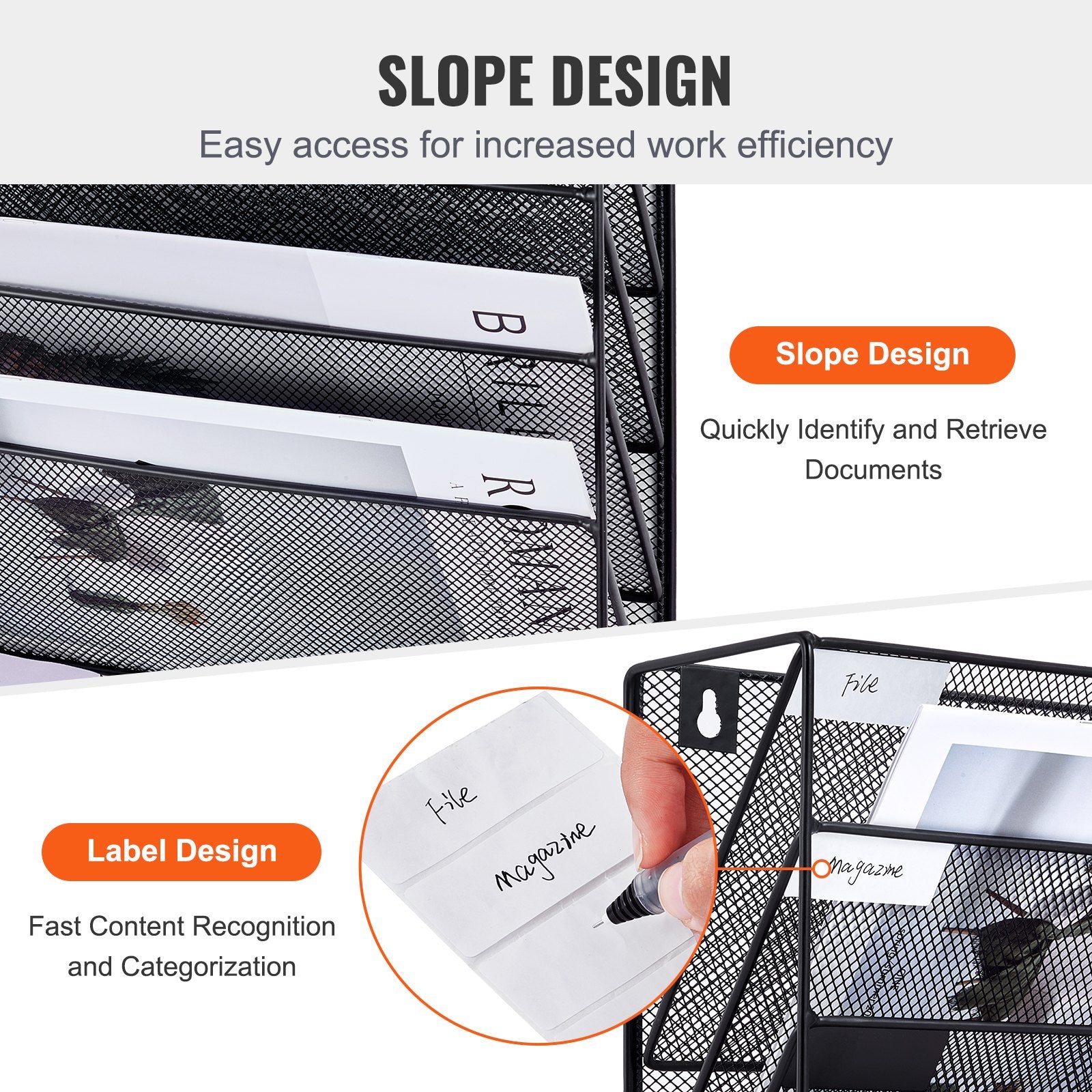 Label and Go: Each pocket in our wall-mounted file organizer is labeled so you can quickly find and grab what you need. Our curved pocket design makes it easy to slide files in and out, saving you time and increasing your productivity. No more digging - every retrieval is a breeze.