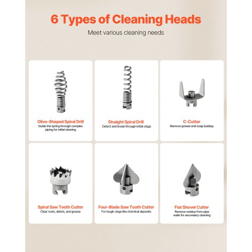 6 utbytbara skärare: Utrustad med en mångsidig uppsättning rengöringshuvuden som enkelt kan ställas in för att hantera olika typer av blockeringar. Från små dagliga blockeringar till envisa blockeringar hanterar vår rörrengöringsmaskin dem snabbt och effektivt.