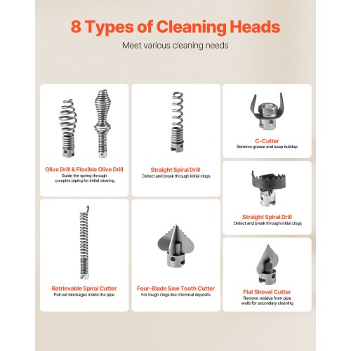 8 utbytbara skärare: Utrustad med en mångsidig uppsättning rengöringshuvuden som enkelt kan ställas in för att hantera olika typer av blockeringar. Från små dagliga blockeringar till envisa blockeringar hanterar vår rörrengöringsmaskin dem snabbt och effektivt.