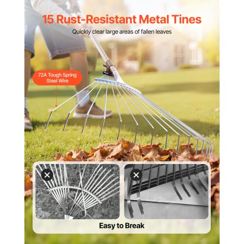 Hållbar och rostbeständig: De 15 pinnarna är tillverkade av 72A fjäderståltråd, byggda för att motstå brott eller böjning. Oavsett om den förvaras vid skjulet eller lämnas vid uteplatsen, står denna lövkratta starkt mot sol och regn utan att rosta.