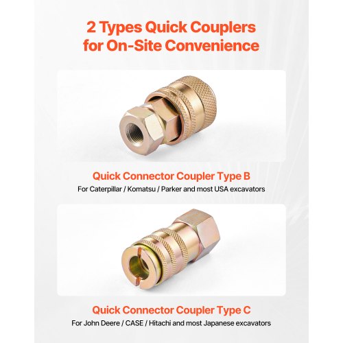 Bred kompatibilitet: Detta hydrauliska tryckmätarkit täcker G-, M-, UNF- och NPT-gängor och inkluderar snabbkopplingar av typ B och typ C för flera hydrauliska system. Den flexibla slangen förlängs enkelt in i smala eller svåråtkomliga testpunkter.