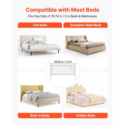 Passar de flesta sängar: Höjden kan justeras upp till 210 mm och passar en sängsida upp till 1,5 m. Kompatibel med madrasstjocklekar från 5–27 cm. Fungerar med massiva träramar, barnsängar, plattforms-/platta botten, madrasser och andra sängar.