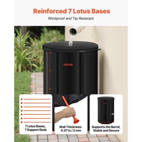 Stabil och säker: Regnvattenuppsamlaren har sju 2 mm tjocka stödstänger och en lotusbas för stabilitet. Även fulladdad förblir den upprätt och fixerad i marken och motstår kraftigt regn och stark vind utan att tippa eller kollapsa.