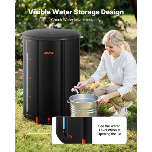 Bekväm upplevelse: Regnvattentunnan har en transparent kropp med skallinjer för enkel kontroll av vattennivån. En bred nätöppning och två kranar ger snabb tillgång till vatten, perfekt för trädgårdar, gårdar, nödförnödenheter och utomhusbruk.