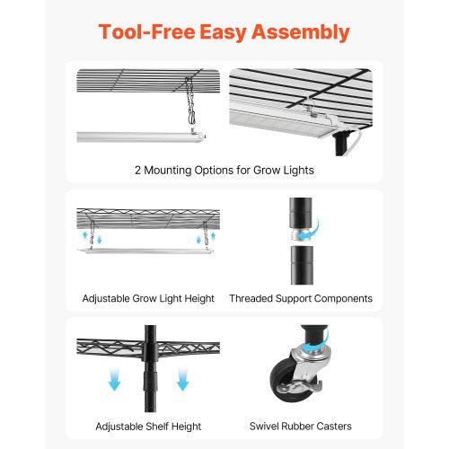 Robust och pålitlig: Byggd med kraftiga 0,9 mm järnrör för starkt stöd, klarar växtlampshyllan upp till 100 kg. Pulverlackerad för att motstå rost. Läckagesäker PP-brickor skyddar kretsarna från vatten. Inkluderar remmar för att säkra växterna säkert.