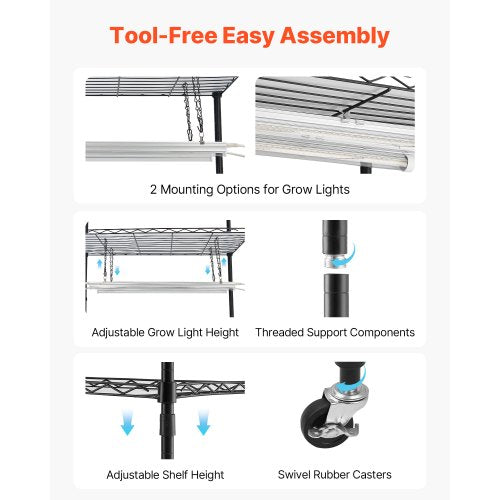 Enkel montering och mobilitet: Inomhusväxthuset med odlingslampa levereras med alla nödvändiga tillbehör för snabb och verktygsfri installation. Justerbara hyllor passar växter i olika höjder. Fyra kraftiga svänghjul gör det enkelt att flytta stativet.