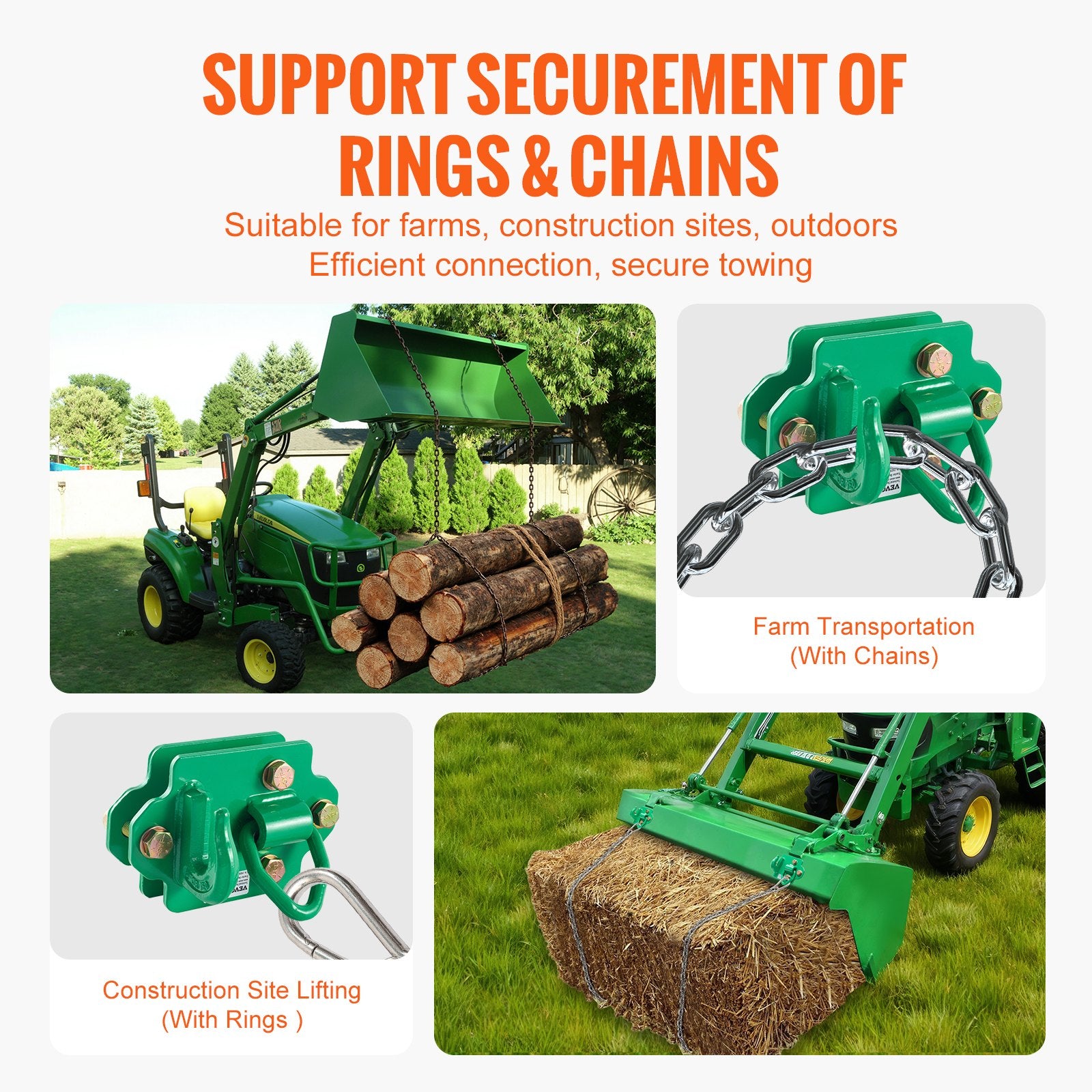 Easy Installation: The tractor grapple hooks are compatible with 3/8" chains and fit most vehicles, including agricultural vehicles, tractor buckets, and off-road vehicles. It can be easily assembled and disassembled, allowing for convenient use without the need for drilling or external tools. The installation process consists of just four simple steps, making it user-friendly and effective for everyone.
