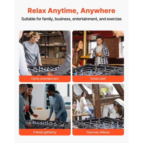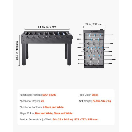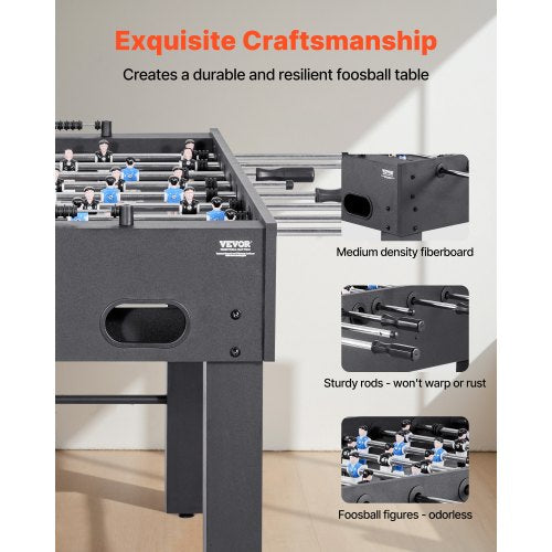 Robust och hållbart: Det 55-tums fotbollsbordet är tillverkat av slitstark fiberplatta med medeldensitet. Det har plats för 26 spelare och 4 fotbollar. Stavarna är raka och släta, vilket säkerställer kraftfulla slag utan att böjas eller rosta.