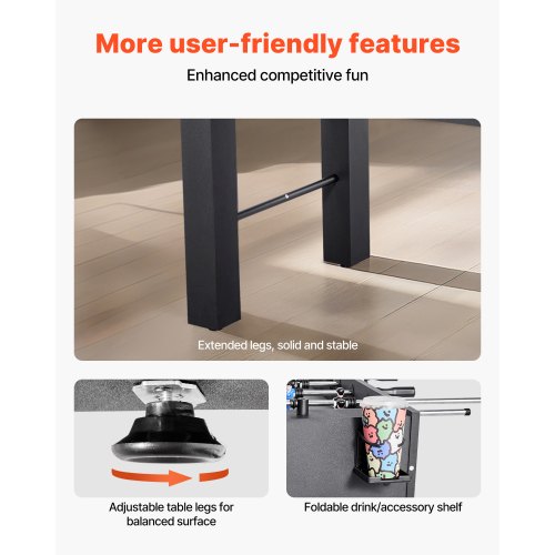 Smidig bollrörelse: Fotbollsbordets bekväma höjd passar de flesta. Förlängda ben säkerställer bordets stabilitet, och du kan justera dessa ben för att bibehålla en balanserad spelyta för mer exakt bollkontroll.