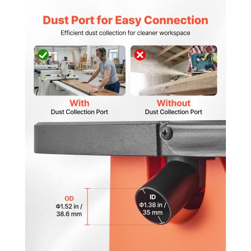 Dammfri drift: Utrustad med en dammport på 35 mm innerdiameter och 38,6 mm ytterdiameter, ansluts vår bandslipmaskin enkelt till dammslangar för effektiv dammuppsamling, vilket minskar rengöringen och håller din arbetsyta renare.