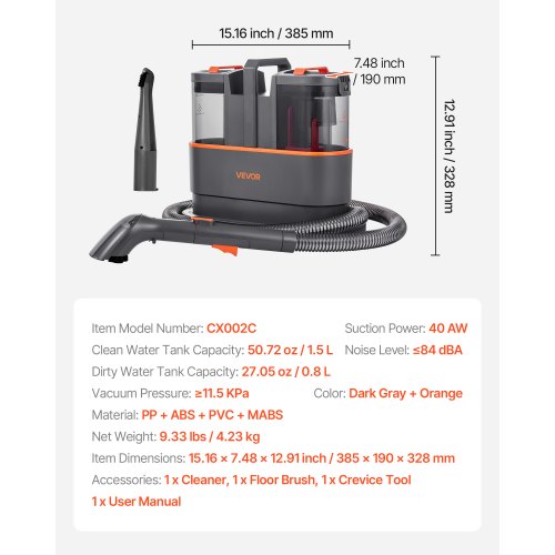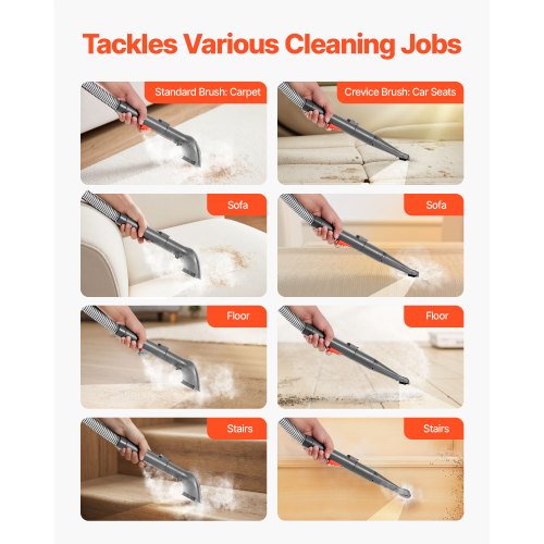 Effektiv rengöring: Vår mattvättmaskin har en 5,9 meter lång strömsladd och en 1,5 meter lång flexibel slang för att täcka hela rummet, vilket eliminerar behovet av att flytta på apparaten och leta efter uttag. Inkluderar mattborste (kombination av borste och sug för kaffe-/syltfläckar) och fogmunstycke (för glipor i möbler) för fullständig rengöring av hemmet.