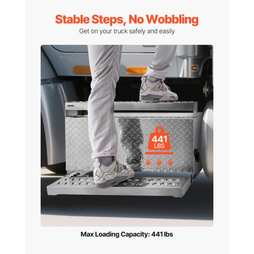 Stabila steg, inget vinglande: Denna kraftiga verktygslåda i diamantformad aluminium är byggd med 2 mm förtjockade stegplattor och en 3 mm förtjockad verktygslåda. Den erbjuder en robust struktur och stöder upp till 200 kg, vilket garanterar säker och stabil in- och urstigning för förare.