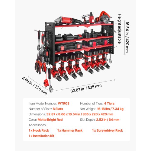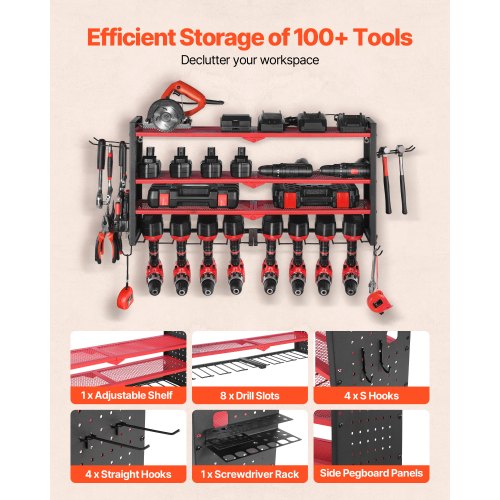 Väggmonterad verktygsorganisatör, 4-lagers förvaringsställ med 8 borrhållare, verktygshållare och förvaringsställ med sidoplatta, verktygsorganisatör för garage, arbetsbänk och verkstad | EU