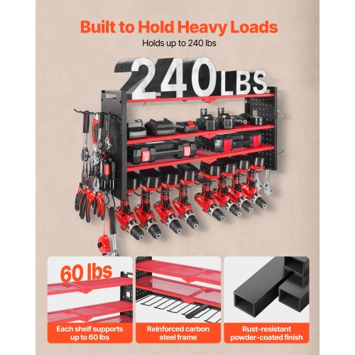 Robust och hållbar: Förvaringsstället för elverktyg i premiumkolstål klarar en totalvikt på 240 lbs (60 lbs per våning). Den pulverlackerade finishen motstår rost och näthyllor förbättrar luftflödet för att hålla verktygen svala.