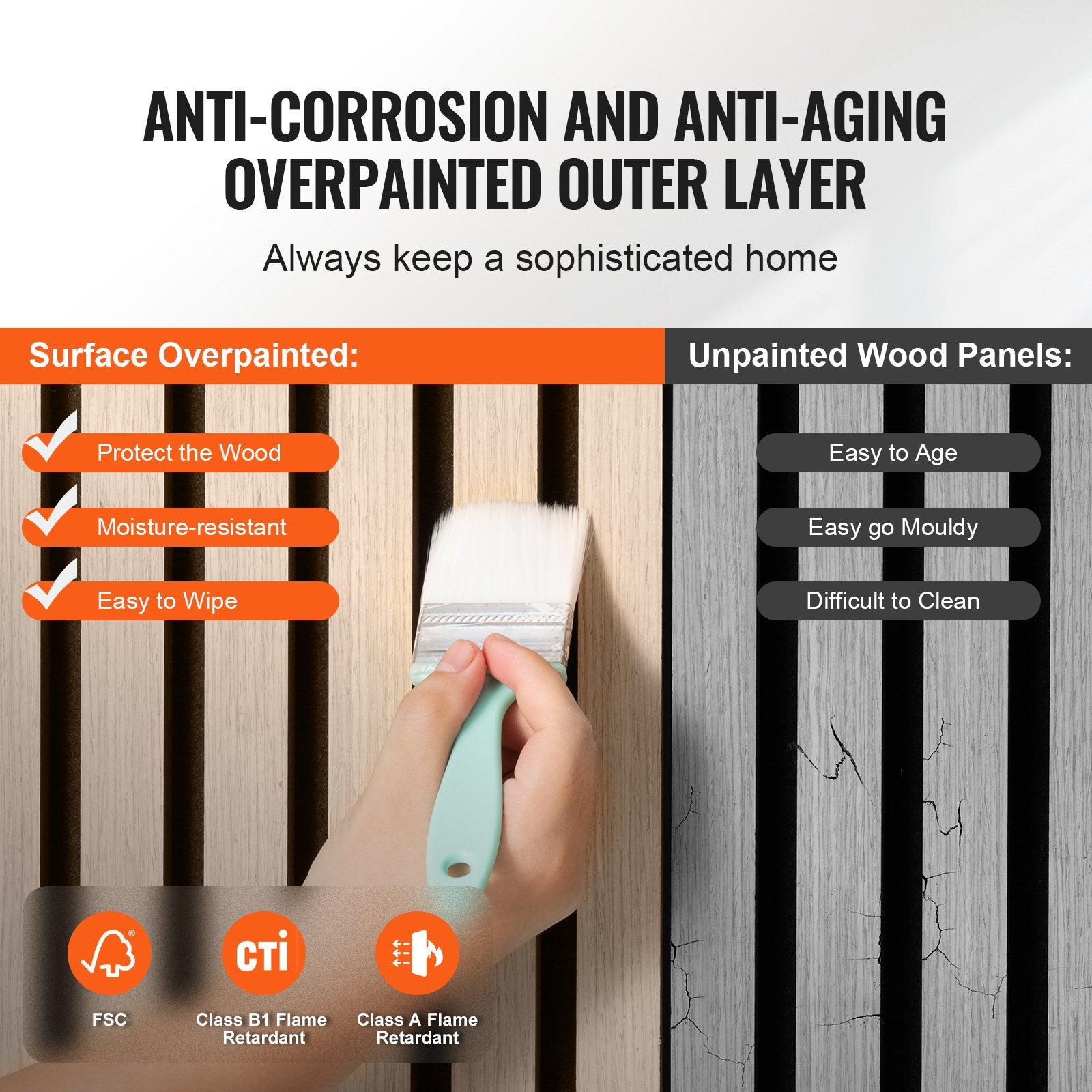 Anti-Aging Coating: Det yttre lagret är behandlat med en korrosionsbeständig, anti-aging finish som uppfyller FSC och B1 brandsäkerhetsstandarder. Detta förbättrar inte bara träets hållbarhet utan ger också utmärkt säkerhet för ditt hem, vilket gör den dagliga rengöringen till en lek.