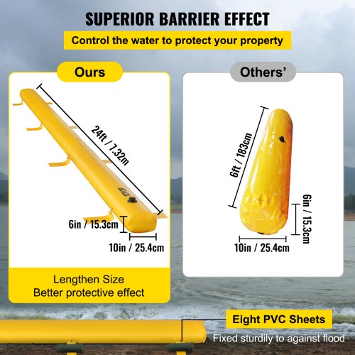 Överlägsen barriäreffekt: 7,2 meter lång x 25 cm bred x 15 cm höjd, rymmer upp till 24,6 gallon med en vikt på 300 kg när den är fylld med vatten. Vi konstruerade en fast mekanism för att stoppa översvämningsbarriärerna från att röra sig i större vattenströmmar.