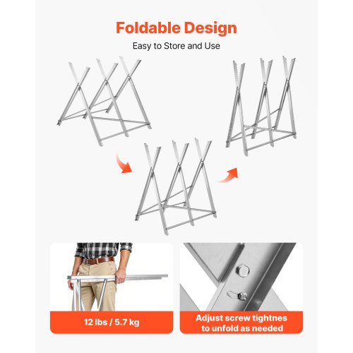 X-formad benram: De X-formade, fällbara sågbockbenen erbjuder balanserat viktstöd och en stabil struktur. Räfflade halkfria spår längs toppen hjälper till att hålla materialen på plats under sågning.
