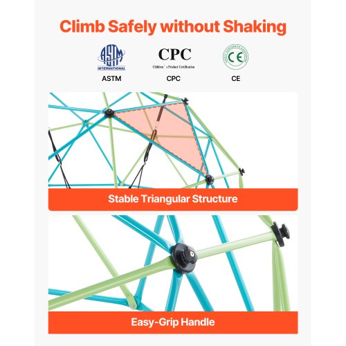 Prioritera säkerhet: Vi sätter barns säkerhet först. Denna geometriska kupolklättrare är ASTM- och CPC-certifierad, vilket ger föräldrar sinnesro samtidigt som de låter barnen utforska säkert och fritt. Halkfria, greppvänliga handtag garanterar säkrare klättring och släta, gradfria rör förhindrar repor.