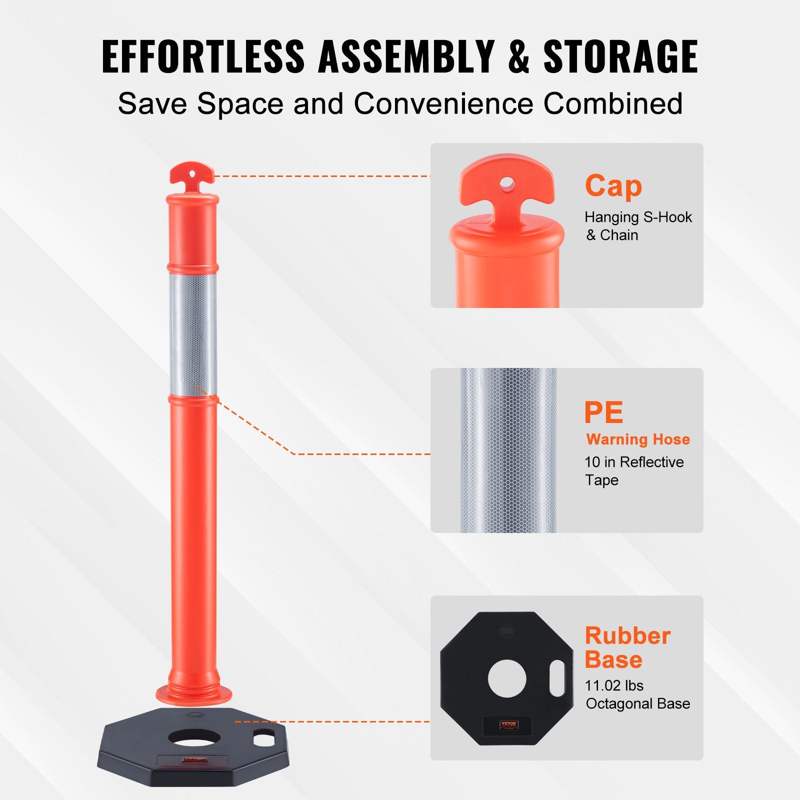Flexibla, flyttbara, men ändå stabila: Trafiksäkerhetsavgränsarna är designade med en piltopp och en bärbar bas, vilket gör dem otroligt lätta att transportera och installera och tillgodose alla trafiksituationer snabbt. Den åttakantiga gummibasen är tillräckligt tung för att hålla stolpen stadigt på plats, även om den välter av misstag, vilket ger orubblig stabilitet när du behöver det som mest.