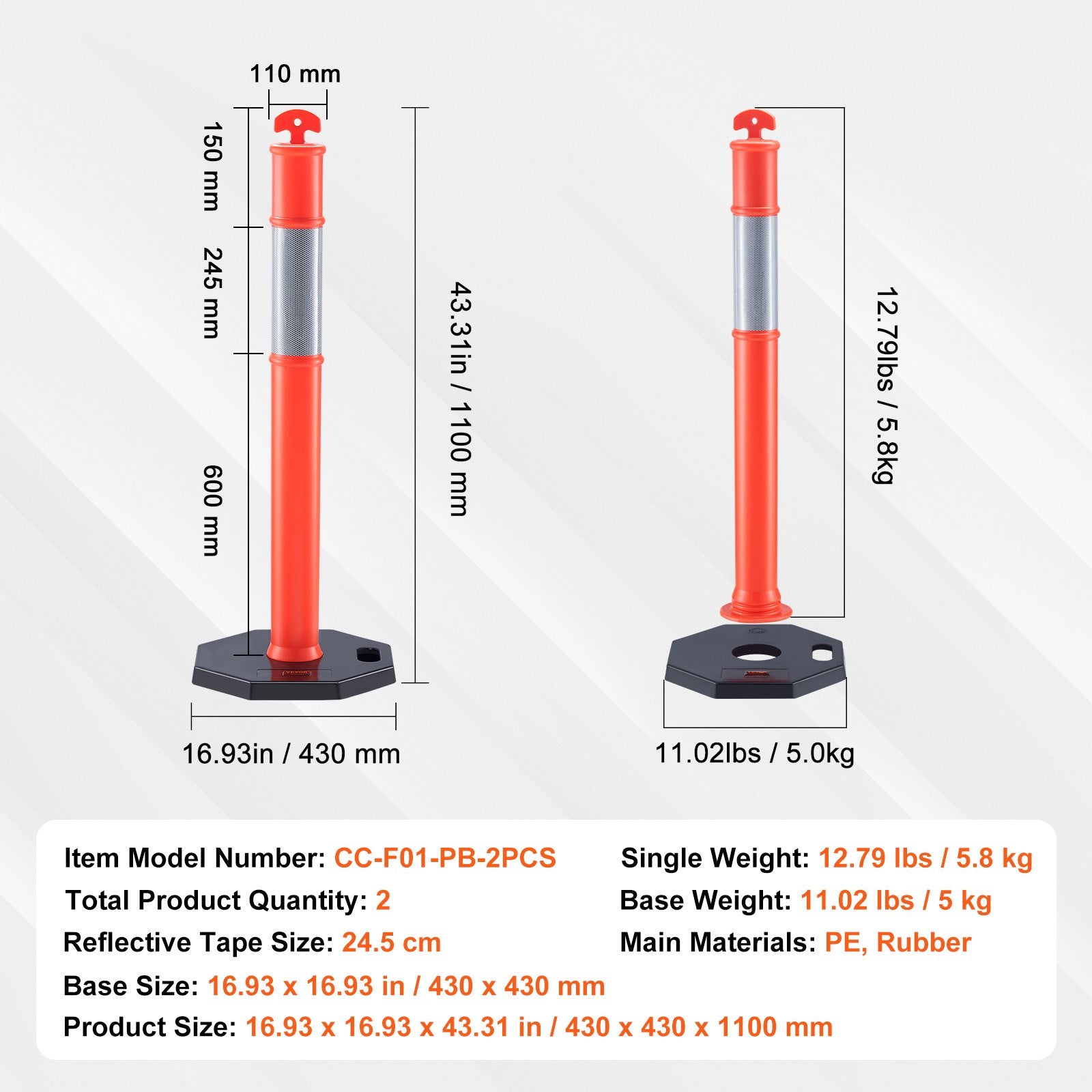 Traffic Delineator-stolpkoner, 2-pack, Trafiksäkerhetsavgränsningsbarriär med 16,93 x 16,93 i gummibas, för trafikkontroll Varning Utomhus användning inomhus Parkeringsplats Konstruktion Varning Vägar