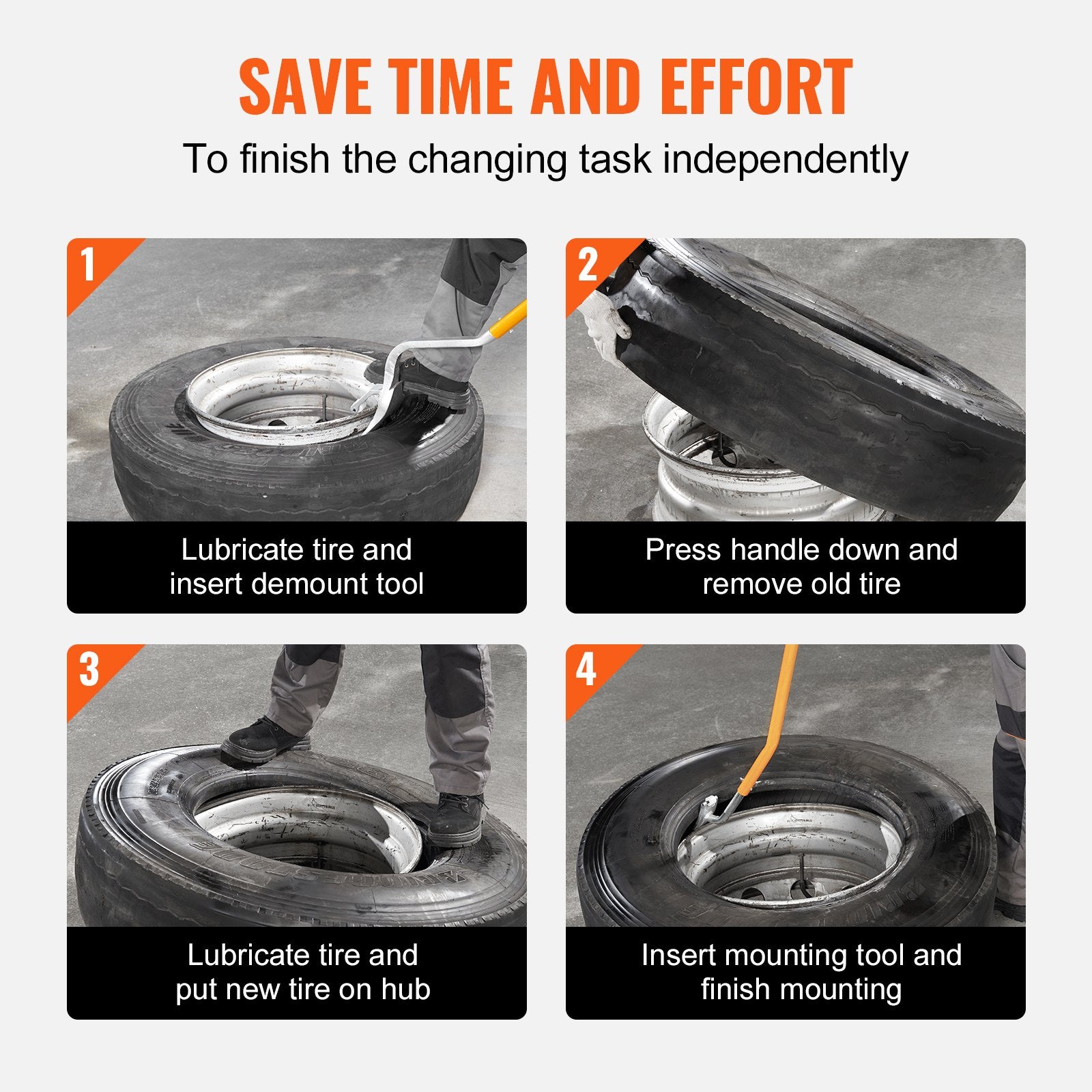 Däckvänlig design: Däckväxlaren är utrustad med förtjockade och släta delar som kommer i kontakt med däcket och hjulnavet. Demonteringsverktyget har en nylonrulle som smidigt förs in i hjulnavet, förhindrar skador eller skav och ser till att dina nya däck förblir intakta. För förbättrat däckskydd rekommenderar vi att du applicerar korrekt smörjning under drift för att minimera friktionen.