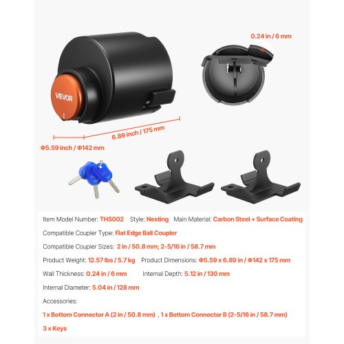 Robust stöldskyddsdesign: Tillverkat av slitstarkt kolstål väger detta släpvagnslås 5,4 kg med en 0,9 cm tjock vägg, vilket gör det motståndskraftigt mot kofot, borrar och verktyg. Det är byggt för att hålla din släpvagn säker och minimera risken för stöld.