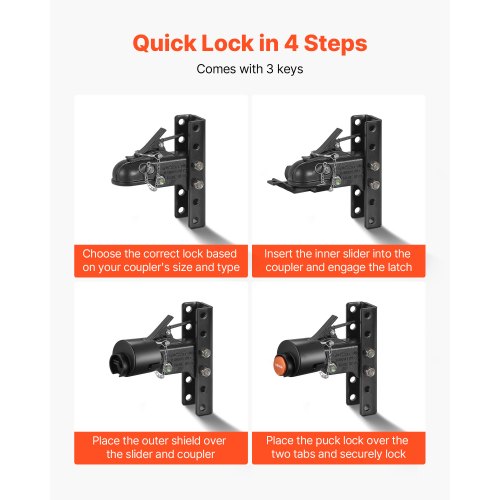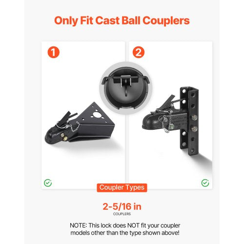 Passar din koppling: Detta kopplingslås passar 2-5/16-tums (58,6 mm) gjuten kulkoppling och erbjuder säkerhet för din husbil eller släpvagn. Obs: Kontrollera kopplingens storlek före köp