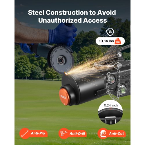 Robust stöldskyddsdesign: Tillverkat av slitstarkt kolstål väger detta släpvagnslås 4,5 kg med en 0,5 cm tjock vägg, vilket gör det motståndskraftigt mot kofot, borrar och verktyg. Det är byggt för att hålla din släpvagn säker och minimera risken för stöld.