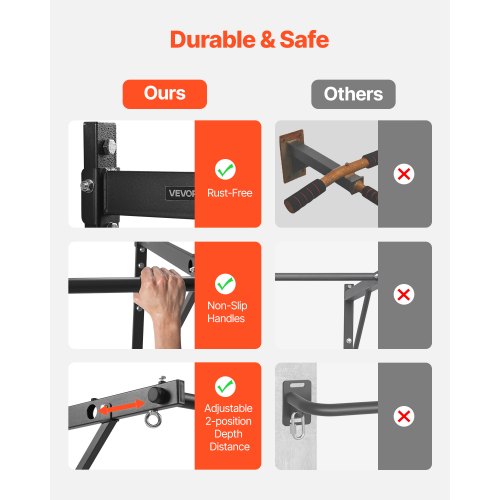 Dubbla justeringsalternativ: Två djupinställningar (50 cm/76 cm) låter dig växla mellan kompakt förvaring och professionella träningslägen. Använd denna robusta väggmonterade pull-up-stång för att enkelt forma din perfekta kropp.