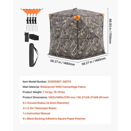 Rymlig design: Mått: 137 x 137 x 170 cm. Med stor interiör rymmer vårt kalkonhjorttält 2-3 personer. Dolt skydd med diamantmönster och varningstyg, avtagbart för ökad synlighet och förhindrande av oavsiktliga skador.