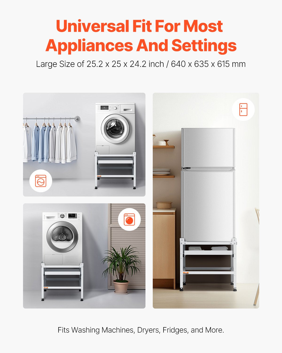 Enkel tvätt: Stigaren för tvättmaskin och torktumlare lyfter tvättmaskinen 24,2 tum / 615 mm från det våta golvet till en mer ergonomisk arbetshöjd. Detta minskar belastningen på rygg och knän, vilket gör att du kan ladda kläder utan att behöva böja dig för mycket och bibehålla rätt hållning medan du tvättar