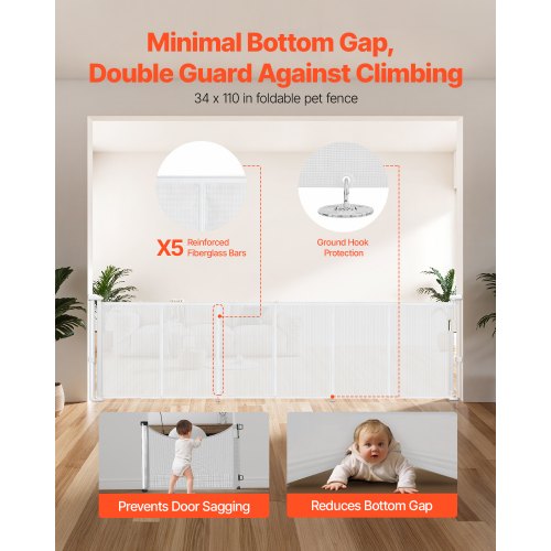 Utdragbar design: Denna vita nätgrind kan förlängas upp till 280 cm i bredd och nätet är 86 cm högt, vilket gör att du kan justera öppningsstorleken efter behov. Den utdragbara designen gör den enkel att förvara när den inte används, tar minimalt med plats och håller ditt hem snyggt och rymligt.