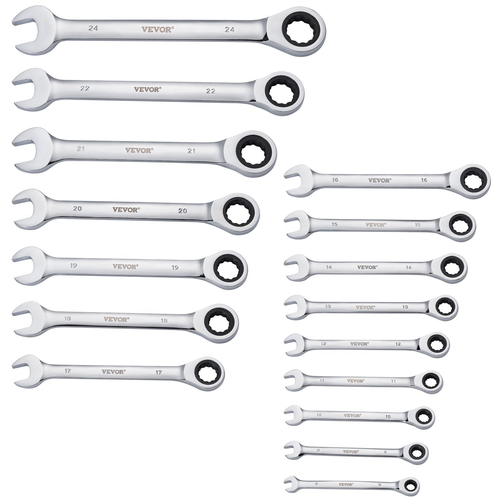 Idealiskt set med 16 delar: Vårt skiftnyckelset innehåller 16 metriska skiftnycklar: 8, 9, 10, 11, 12, 13, 14, 15, 16, 17, 18, 19, 20, 21, 22, 24 mm.