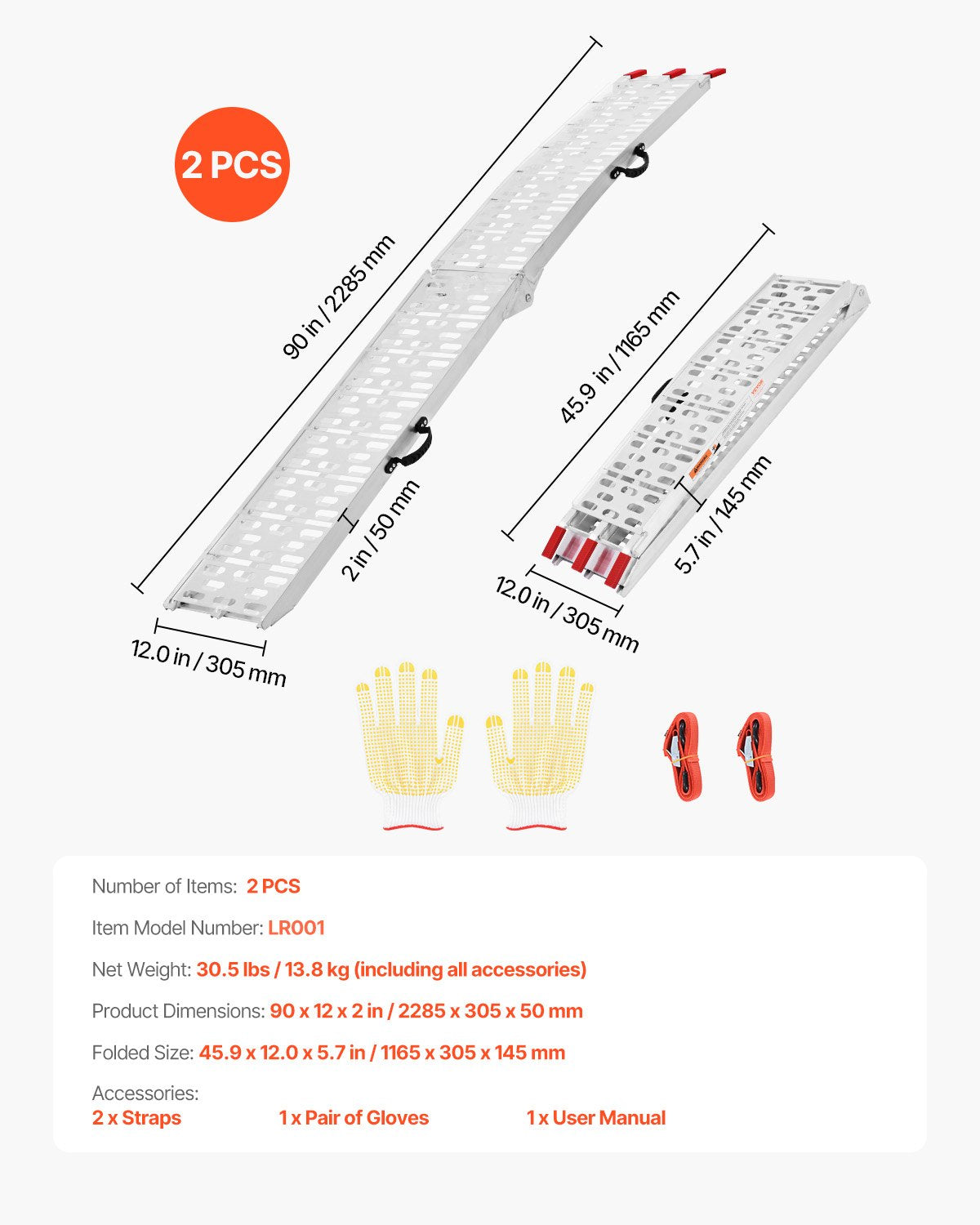 1500 lbs lastkapacitet: Denna välvda ramp stöder en kombinerad lastkapacitet på upp till 1500 lbs, och erbjuder en lätt men ändå stark design. Setet i 2 delar är idealiskt för transport av ATV, UTV, motorcyklar, skjutgräsklippare och elektriska skotrar.