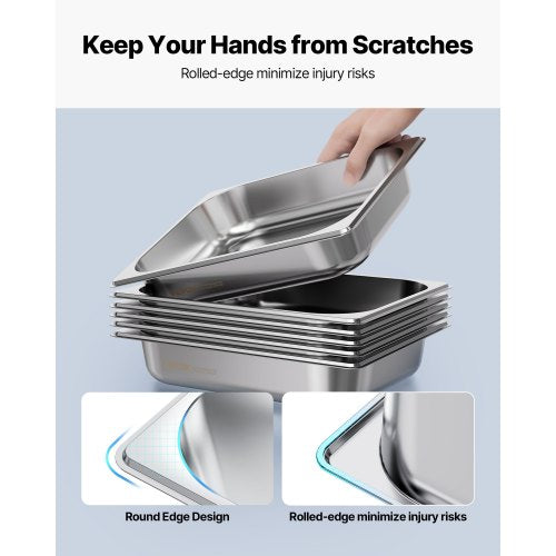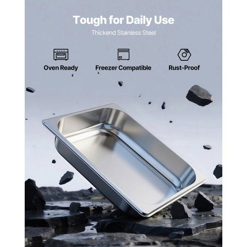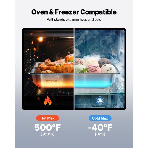 Handelsüblicher Edelstahl: Unsere Hotelpfanne aus Edelstahl ist aus handelsüblichem 22-Gauge-SS201-Edelstahl gefertigt und bietet so lange Haltbarkeit und hervorragende Rostbeständigkeit. Sie eignet sich ideal zur Aufbewahrung von warmen und kalten Speisen und hält Temperaturen von -4 °C bis 260 °C stand. Geeignet für Geschirrspüler, Kühlschränke, Gefrierschränke und mehr, die hohen Temperaturen standhalten.