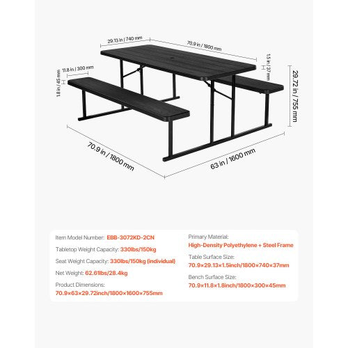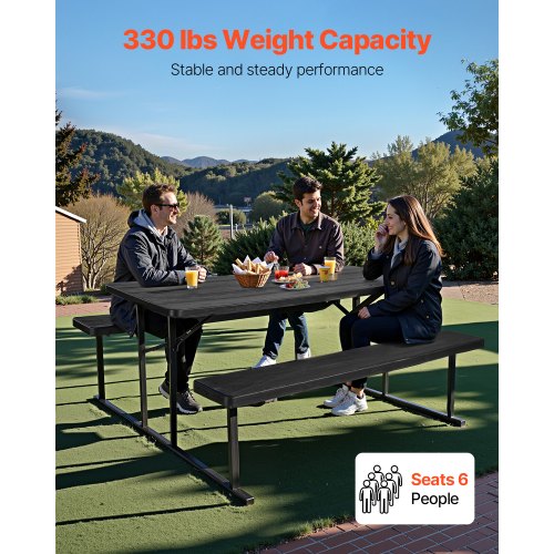 Stabil und langlebig: Die Tischplatte des Outdoor-Picknicktisches besteht aus hochdichtem Polyethylen, das die Haltbarkeit im Freien verbessert und eine hervorragende Wetterbeständigkeit bietet. Die Tischplatte trägt bis zu 150 kg, während jeder Sitz 150 kg tragen kann und Platz für 6-8 Personen bietet, für ein stabiles und sicheres Sitzerlebnis.