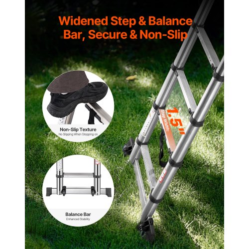 Verbreiterte Stufen: Die Stufen dieser Ausziehleiter wurden auf 3,8 cm verbreitert und bieten so eine bequemere und stabilere Standfläche. Zwei zusätzliche Ausgleichsstangen an der Unterseite erleichtern Ihnen die Arbeit in großen Höhen und reduzieren die Ermüdung bei längerem Gebrauch.