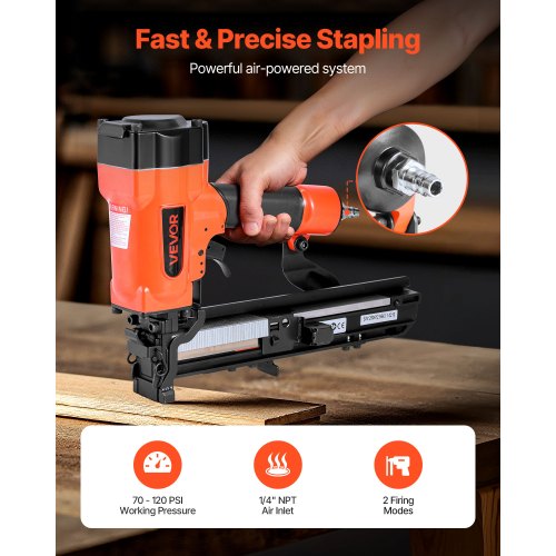Kompatibilitet med klammer: Denna pneumatiska häftpistol passar klammer med 16 gauge bred kronstorlek och 1 tums (26,4 mm) kronstorlek och klammerlängder från 5/8 tum till 1-1/2 tum (16 mm - 38 mm). Driftstryck: 70-120 PSI, Luftinlopp: 1/4 tum NPT. (Klammer ingår ej; köp separat)