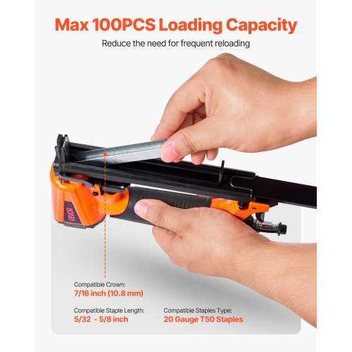 Hög laddningskapacitet: Vår häftpistol har ett laddningsmagasin med stor kapacitet som rymmer upp till 100 klammer åt gången, vilket säkerställer effektivt arbete utan frekvent omladdning. (Klammer ingår ej; köp separat)