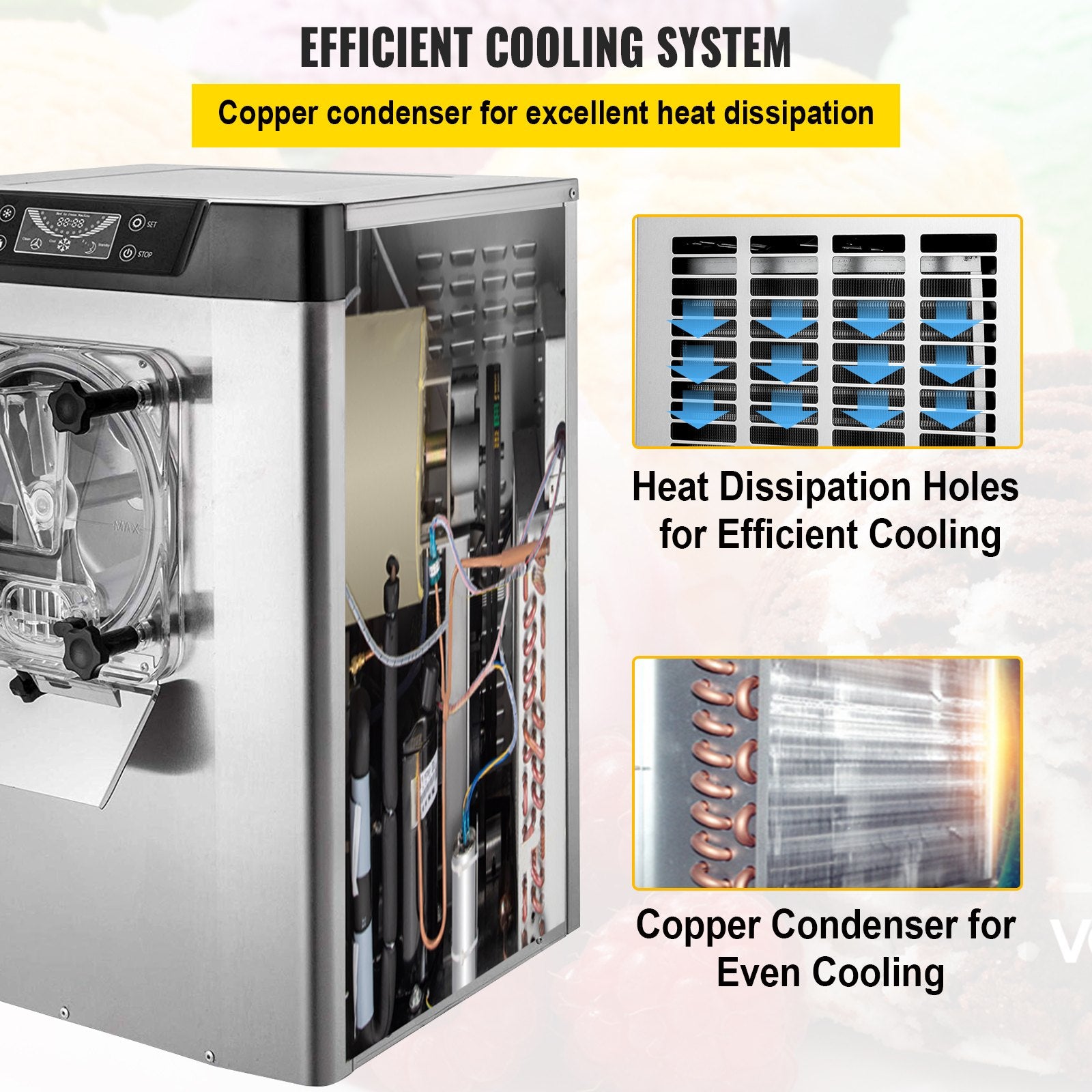 Effiziente Eisherstellung: Dank des integrierten 4,2-Liter-Kühlzylinders erzielt die VEVOR-Eismaschine für den gewerblichen Gebrauch eine hohe Eisausbeute von ca. 16–20 Litern pro Stunde. Der rotierende Schneebesen sorgt für eine optimale Luftzirkulation und sorgt so für ein cremiges Ergebnis.