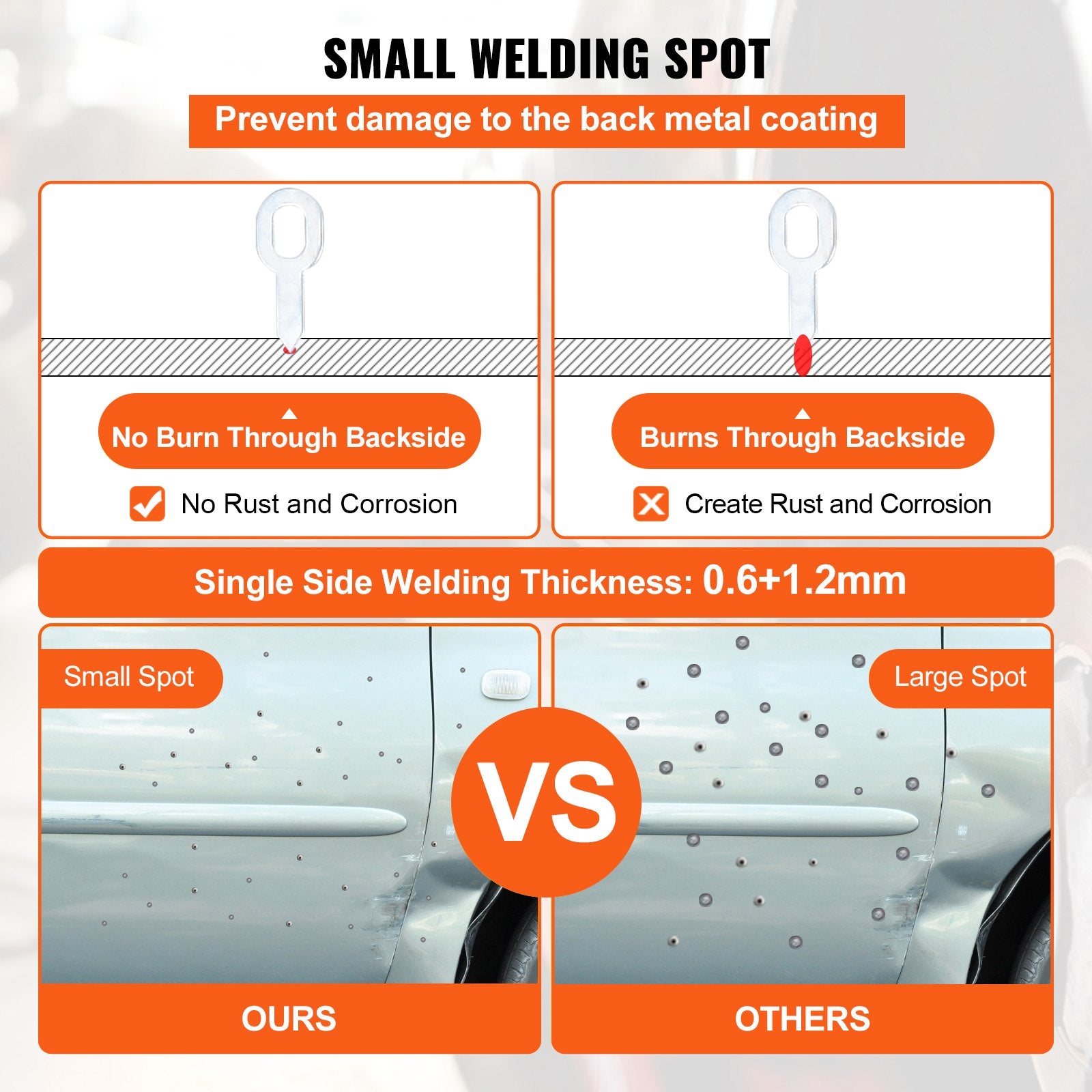Kleine Schweißspuren: Im Vergleich zu anderen Produkten beträgt die einseitige Schweißdicke unseres Punktschweißgeräts 0,6 + 1,2 mm. Dadurch sind die Schweißpunkte klein, die Festigkeit jedoch relativ hoch und die rückseitige Metallbeschichtung bzw. Lackoberfläche wird nicht beschädigt.