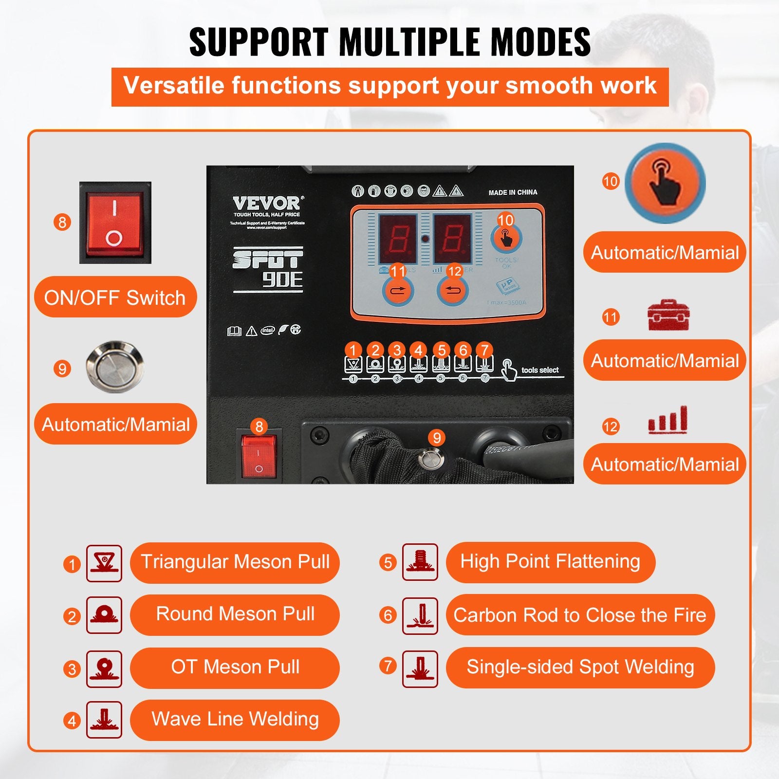 7 Modi zur Auswahl: Sieben Schweißmodi stehen zur Auswahl; mehrere Schweißleistungsstufen lassen sich einstellen; Funktionen und Leistung werden auf dem digitalen Bedienfeld angezeigt. Sie können jederzeit zwischen automatischem und manuellem Betrieb wechseln – einfach zu bedienen und zeitsparend.