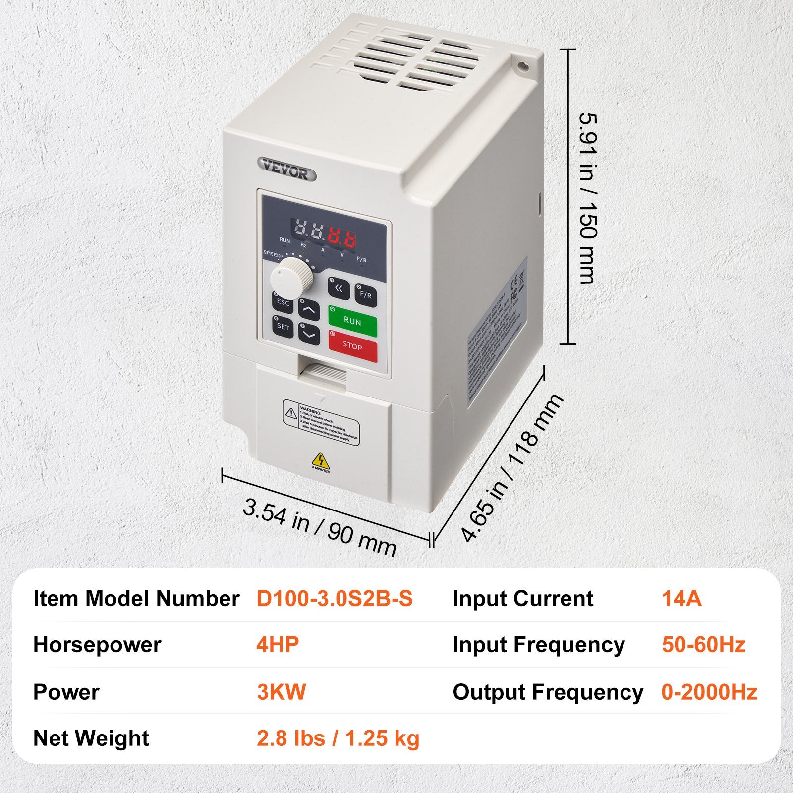 Wichtige Parameter: Leistung: 3 kW, PS: 4 PS, Eingangsstrom: 14 A. Eingangsphase: Einphasiger Wechselstrom 220 V oder Dreiphasiger Wechselstrom 220 V; Ausgangsphase: Dreiphasiger Wechselstrom 0–220 V. Eingangsfrequenz: 50/60 Hz; Ausgangsfrequenz: 0–2000 Hz.