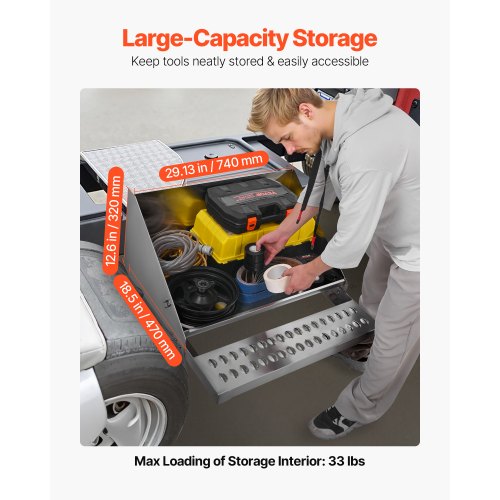 Säker och effektiv förvaring: Med ett rymligt förvaringsutrymme på 740 x 470 x 320 mm och stötdämpande gummispärrar, förvarar denna förvaringslåda säkert skiftnycklar, skruvmejslar, handskar och andra viktiga saker, och håller dem prydligt organiserade och lättillgängliga.