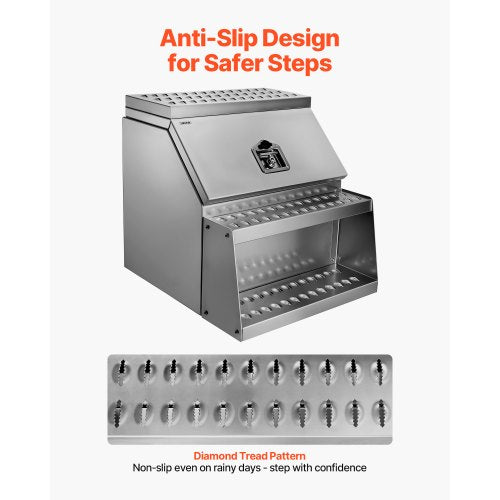 Starkt halkskydd: De förtjockade stegplattorna med halkskyddsmönster ökar greppet avsevärt och minskar risken för halka. I regn eller snö ger vår sidomonterade verktygslåda för lastbilar en stabil plattform för säkrare och enklare i- och urstigning.