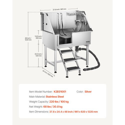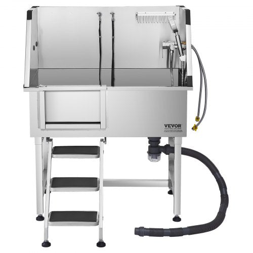 96,5 cm Edelstahl-Hundepflegewanne mit Stufen, Wasserhahn, linke Tür