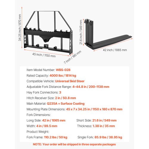 Hållbar stålkonstruktion: Byggd för att hålla! Våra kraftiga pallgafflar för kompaktlastare och monteringsplatta är tillverkade av höghållfast kolstål, belagda för att motstå korrosion och rost. Njut av många års pålitlig och robust prestanda. OBS: Din beställning skickas i 3 separata paket, spåra vart och ett individuellt.
